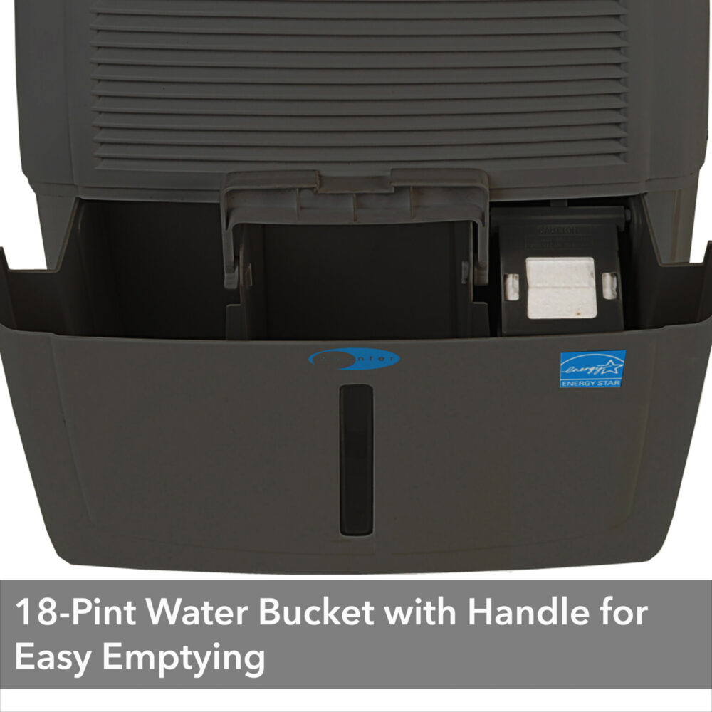 This portable dehumidifier can be continuously operated with 3 drainage options; manual drain, gravity drain, and condensate pump drain. This portable dehumidifier includes a 18-pint bucket that can be removed and emptied. The condensate pump can pump out (and up) condensation water through the included 16.5’ drain for continuous water removal with approximately 15’ of vertical lift.