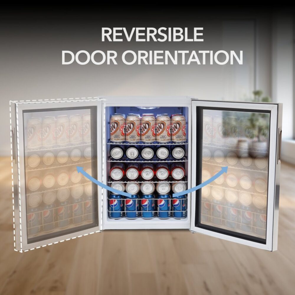 The stainless steel trimmed glass door and soft LED lighting allows you to see view the contents while maintaining internal temperatures and increasing energy efficiency. The Whynter 90 Can Stainless Steel Beverage Refrigerator is equipped with a lock to keep your beverages safe and secure. The door swing direction is also reversible for customization to your specific requirements.