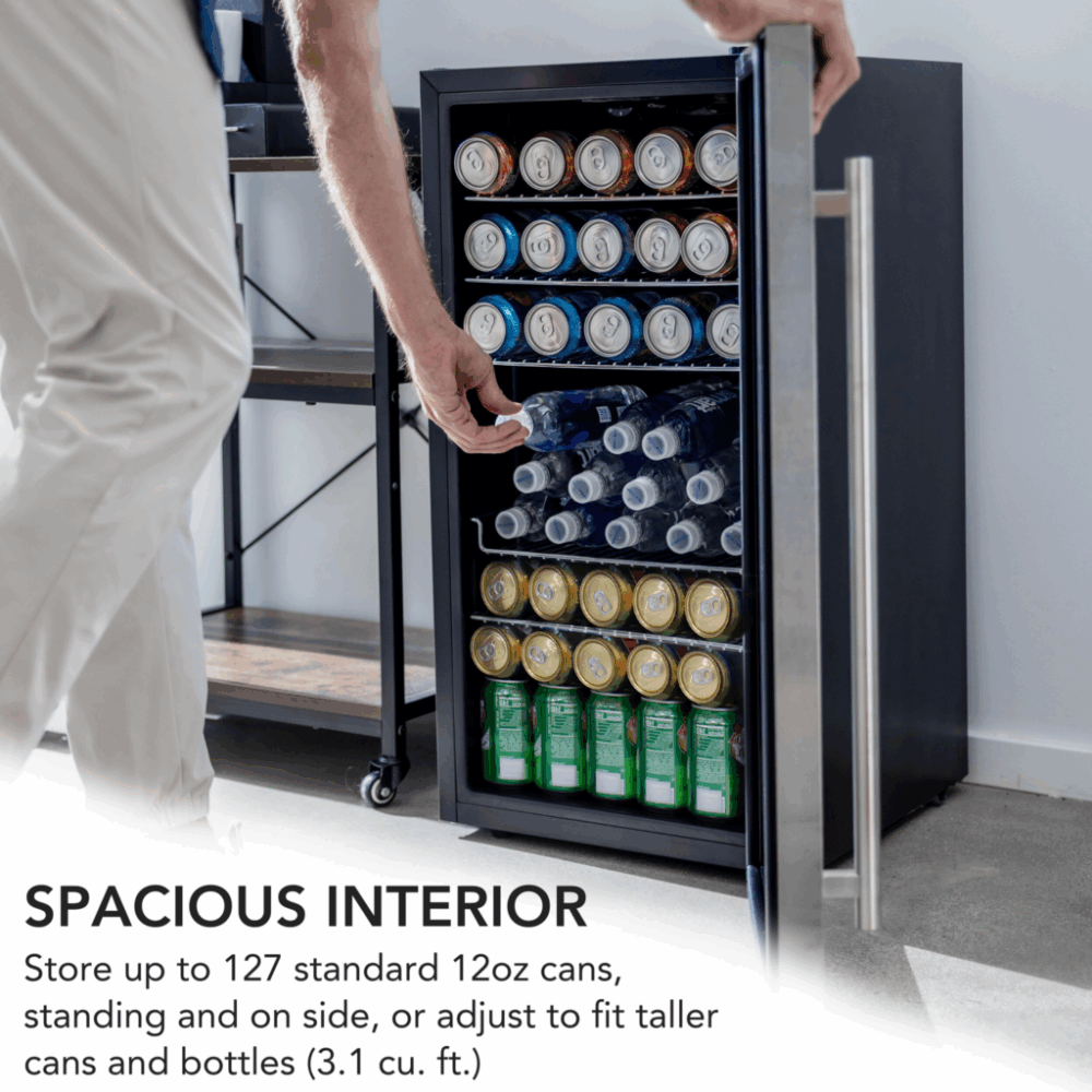 The Whynter 127 Can Stainless Steel Beverage Refrigerator with internal fan is the ideal choice for compact and efficient beverage display and refrigeration. The Whynter Beverage Refrigerator / Cooler offers a compact and powerful cooling solution ideal for your entertaining needs.