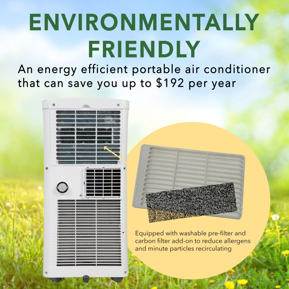 Optimize your space with the Whynter ARC-102CS 10,000 BTU (7,000 BTU SACC) Compact Portable Air Conditioner. Its versatile design seamlessly transitions between air conditioning, dehumidifying, and fan functions for comfort in areas up to 300 sq. ft. An incredibly compact structure makes it perfect for spaces with limited floor room. The washable pre-filter with an Activated Carbon filter reduce allergens and minute particles. With a convenient remote control and sleek white design, rely on Whynter for high-efficiency, portable climate control solutions.