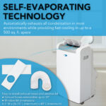 - Removes humidity through automatic evaporation or drainage