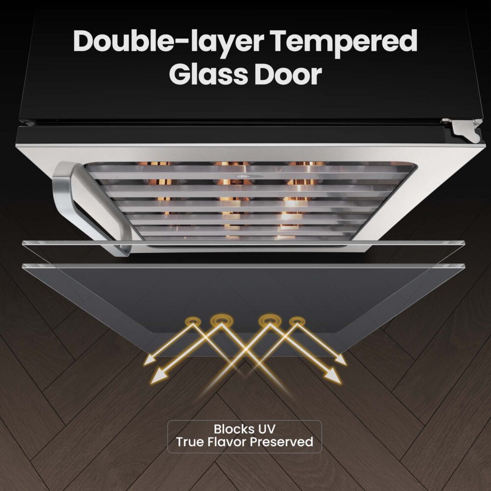 This wine cooler comes with 3-color LED lighting, temperature memory function, eco-friendly refrigerant, activated carbon filtration for odor control, safety lock for wine protection and reversible door installation – perfect for bedroom, office, or bar use.