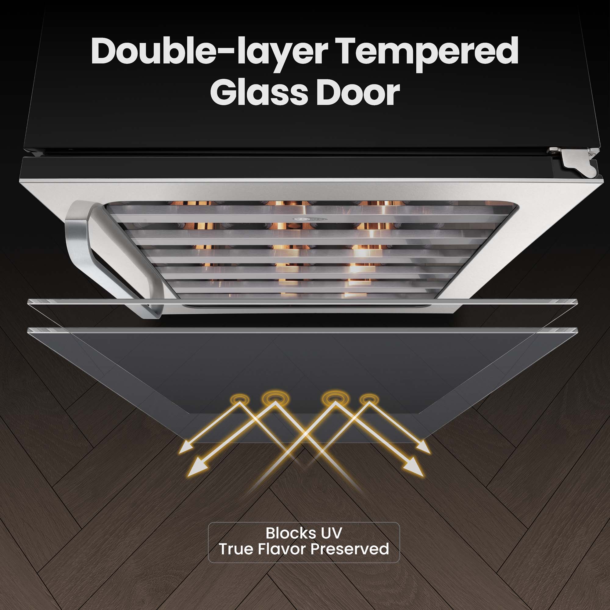 Whynter 24-inch Wine Fridge holds 54 bottles with precise 40-65 °F temperature control. Advanced internal fan-forced circulation ensures uniform temperature distribution in the cabinet. Premium dual-pane anti-UV glass door protects wines from light damage. Elegant curved handles for sophisticated access. Adjustable beechwood shelves allow flexible storage.