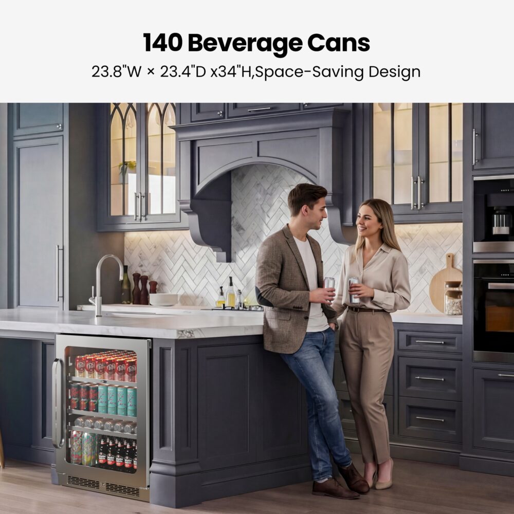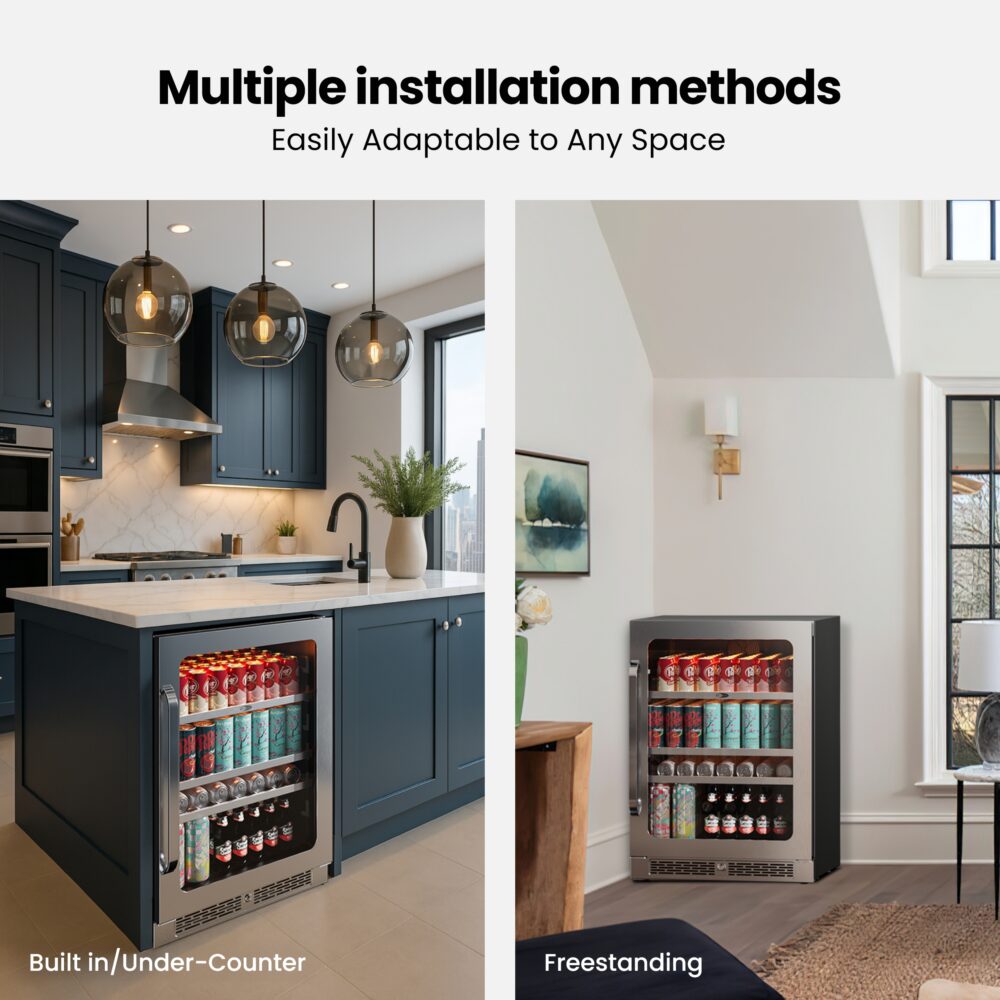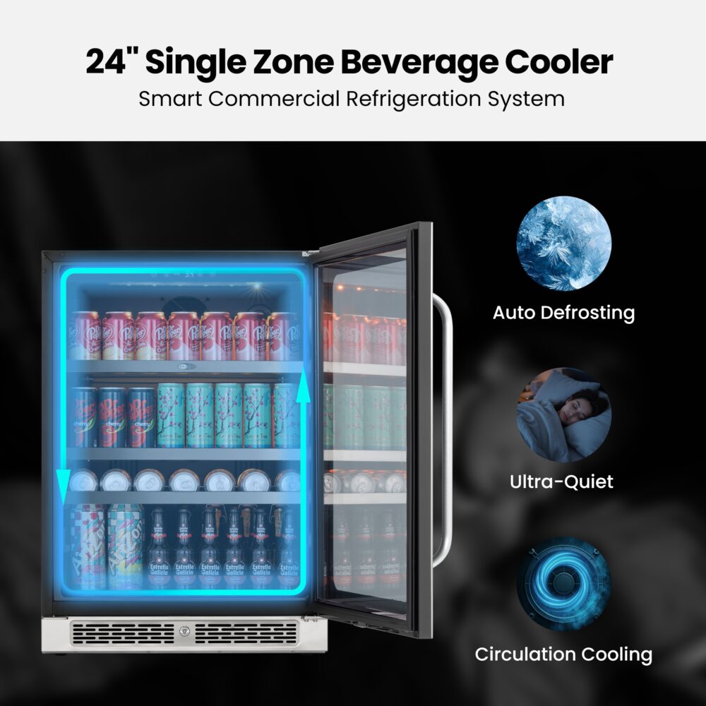 Whynter 24-inch Beverage Refrigerator holds 140 cans with precise 34-54°F temperature control. Advanced internal fan-forced circulation ensures uniform temperature distribution in the cabinet. Features a fingerprint-resistant stainless steel and dual-pane anti-UV glass door to protect drinks from light damage. Adjustable tempered glass shelves allow flexible storage.
