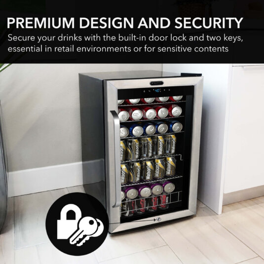 Designed with a classy, clean white exterior, Whynter offers this commercial soda fridge for visible storage and display of beverages. The CBM-815WS Commercial Beverage Merchandiser cooler provides full, easy temperature control with an intuitive touch screen, along with energy-efficient lighting in a design made to be both durable and attractive. The powerful cooling ability makes this fridge a good fit for corporate and home settings.
