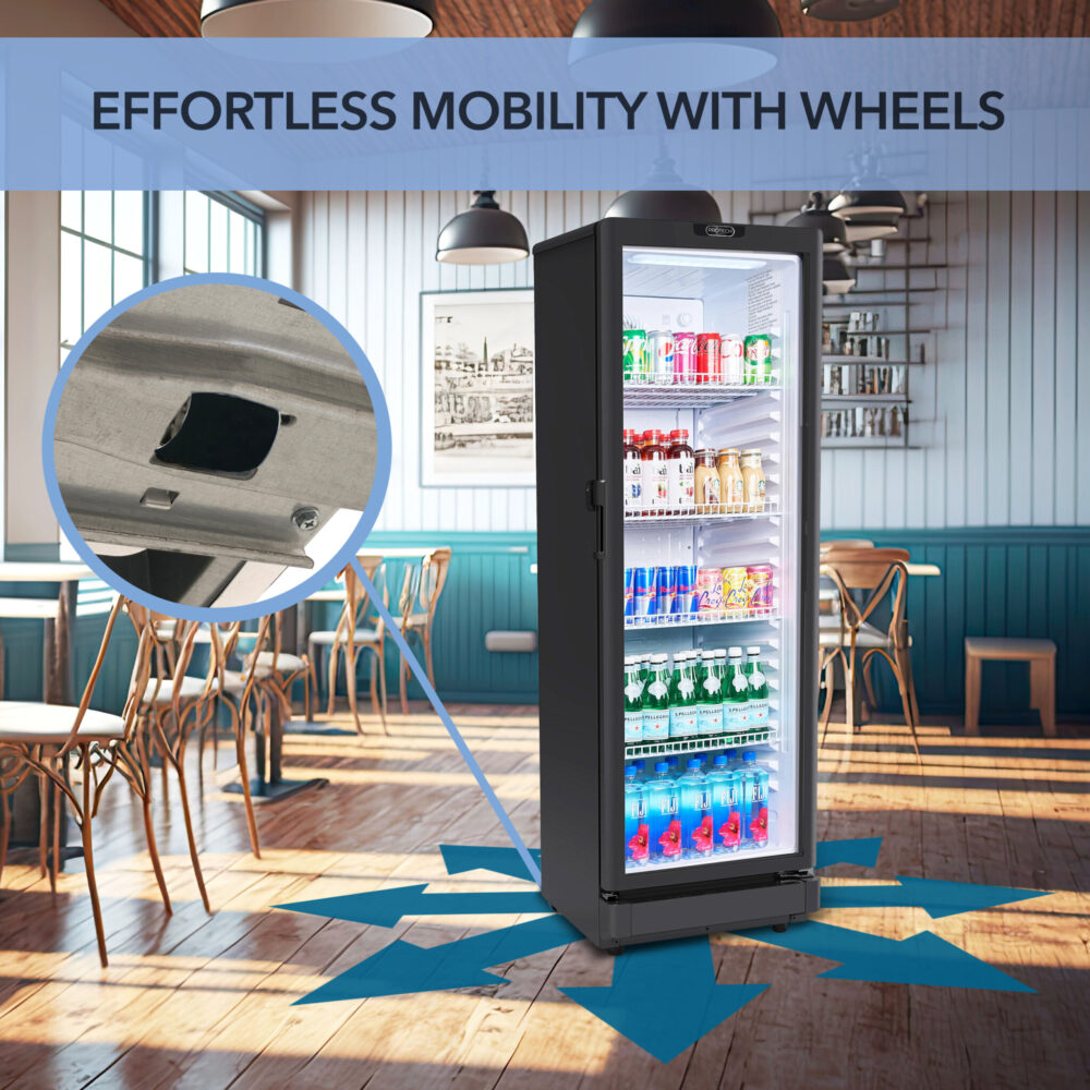 Equipped with smooth-rolling casters and adjustable leveling feet, this refrigerator maintains stability and functionality on all floor types, ensuring it operates efficiently.