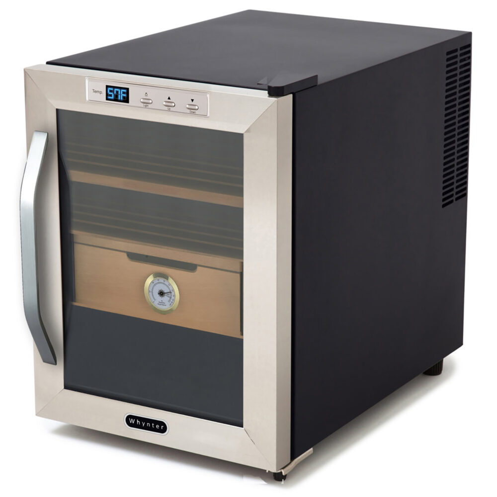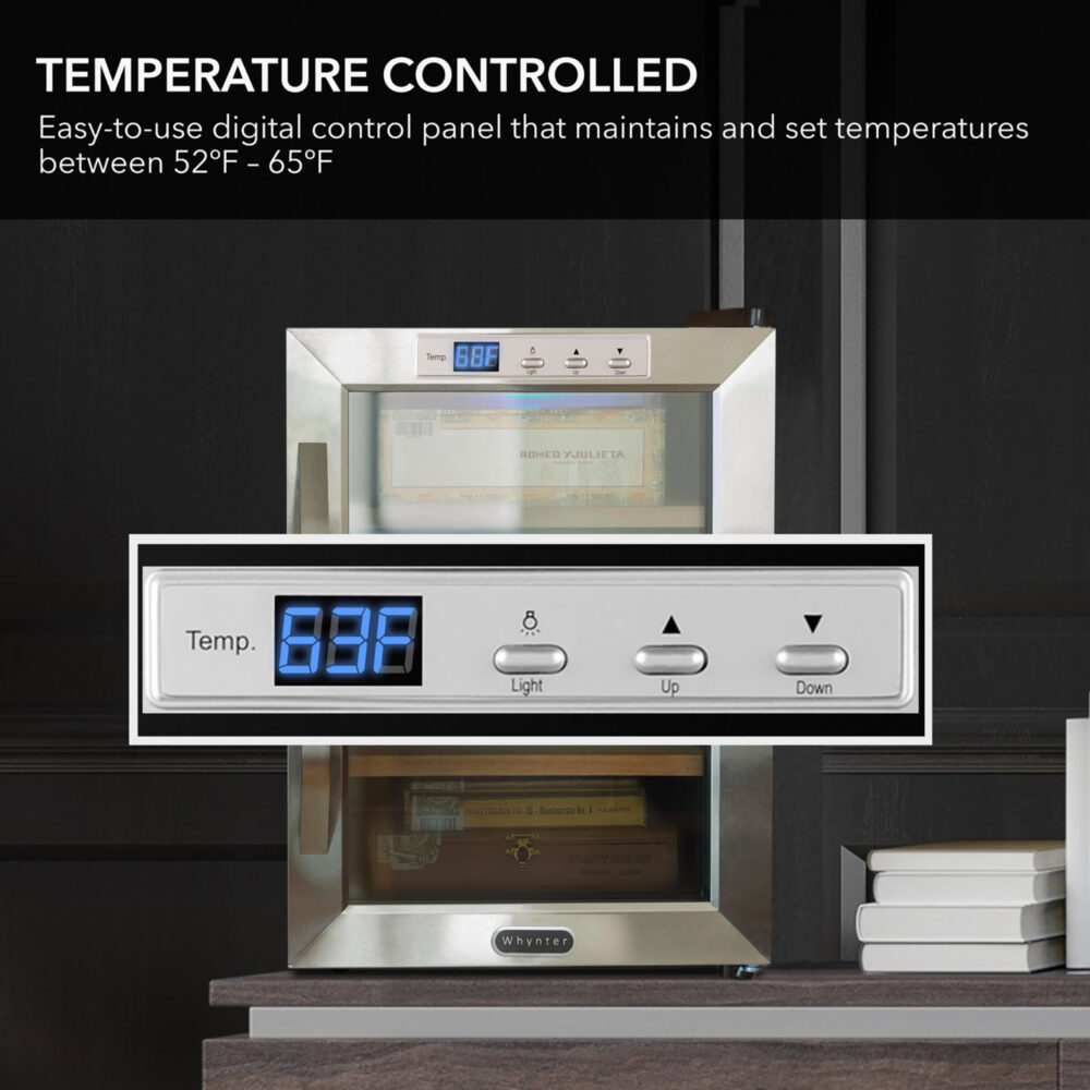 Whynter humidor coolers feature adjustable digital controls. Use the control panel to set your desired temperature. Monitor the built-in manual or digital hygrometers to maintain the proper humidity level, adjusting the humidification system as needed.