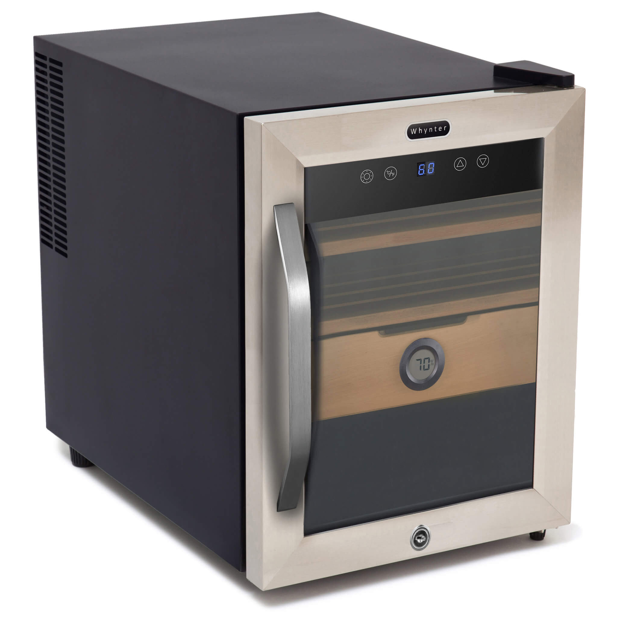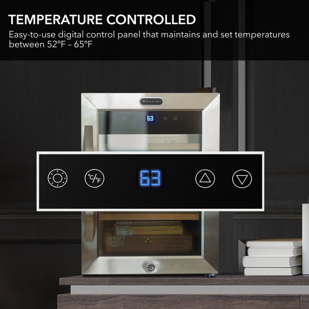 Whynter humidor coolers feature adjustable digital controls. Use the control panel to set your desired temperature. Monitor the built-in manual or digital hygrometers to maintain the proper humidity level, adjusting the humidification system as needed.