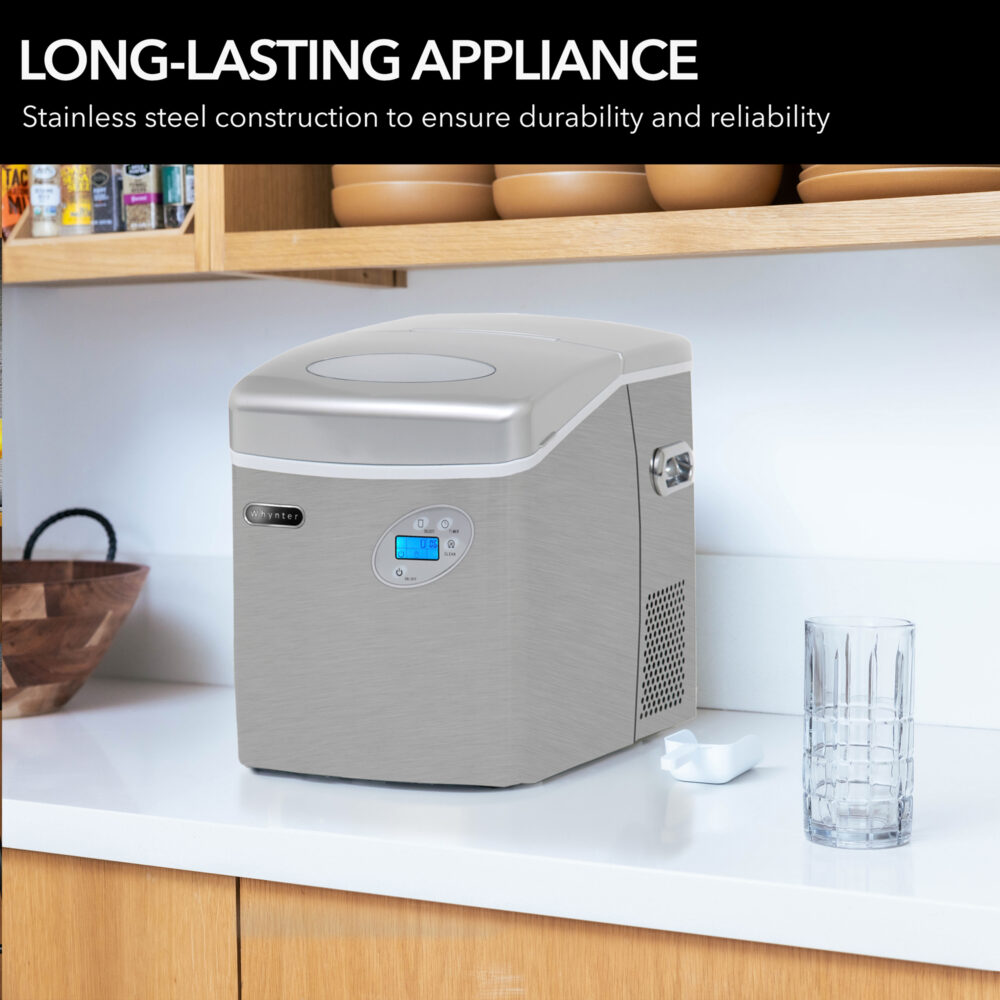 The Whynter IMC-491DC Portable Ice Maker is a premium stainless steel countertop ice maker for use in your kitchen, home bar or office. In addition to quickly and efficiently making perfectly bullet-shaped ice cubes, the Whynter IMC-491DC Portable Ice Maker can produce up to 49 pounds of ice per day. You are also able to control and monitor the ice production on the LED display and soft-touch panel.