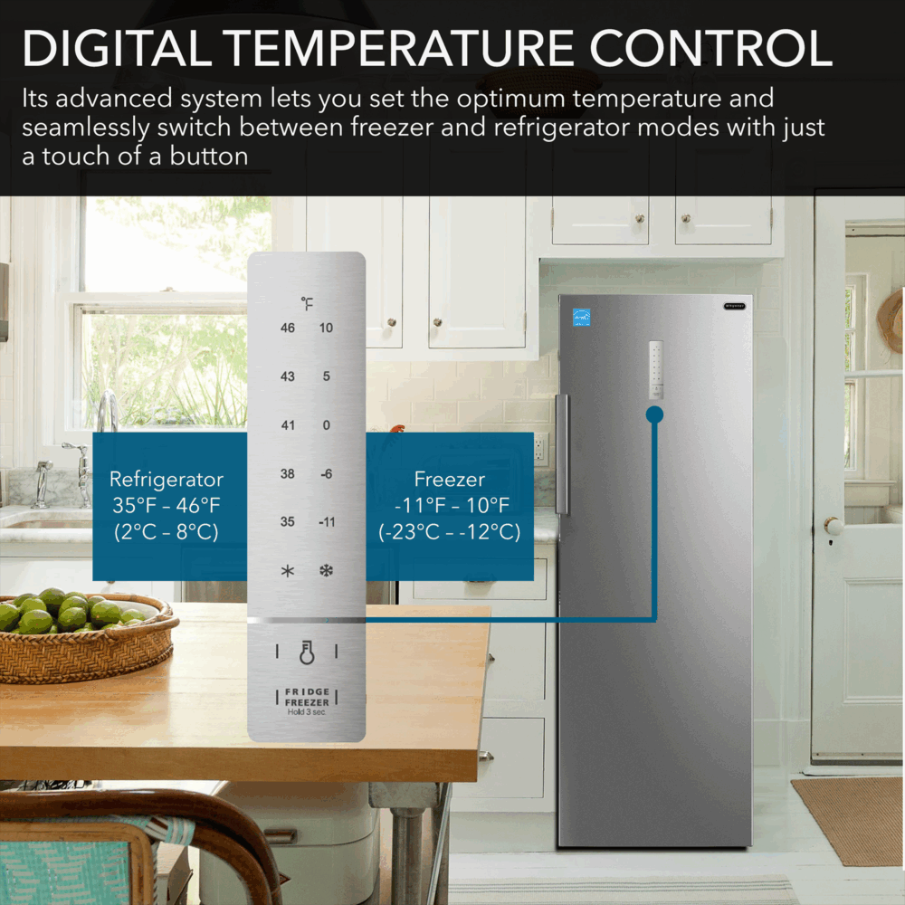 Get the storage space and features you need with the stainless steel Whynter 8.3 cu.ft. Energy Star Digital Upright upright Deep Freezer / Refrigerator. With its powerful fan-circulated compressor, this 6 foot deep freezer ensures the precise airflow for efficient temperature distribution. Additionally, this convenient upright deep freezer frost free design ends the need to manually defrost this upright fridge and freezer.