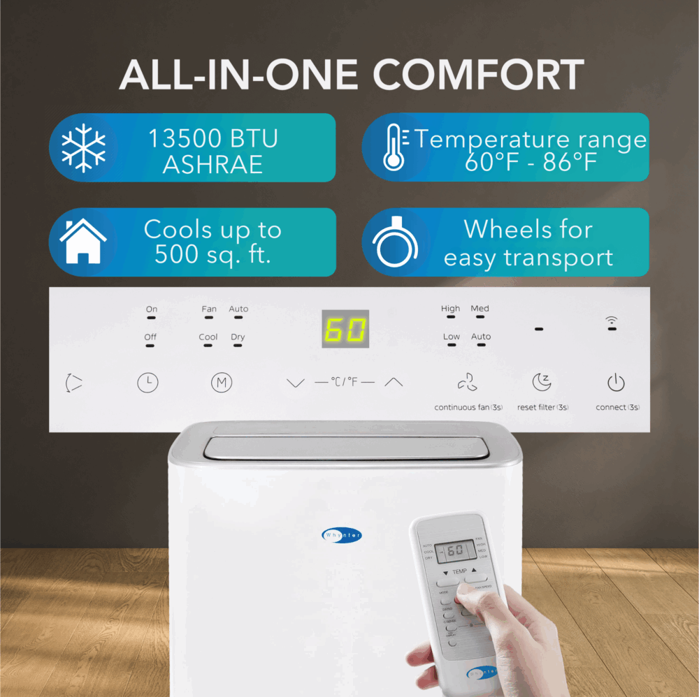 Enhance your home’s climate control with the Whynter ARC-1050XPH MultiCool Smart Control Portable Air Conditioner and Heating Function. This advanced unit combines cooling, dehumidifying, heating, and fan functions, efficiently regulating temperatures in spaces up to 500 sq ft. With WiFi-enabled smart control, adjust settings remotely for unparalleled convenience. Its sleek white design blends seamlessly with any decor, delivering powerful climate control with minimal noise. Trust Whynter for cutting-edge technology and elegant design to keep your environment comfortably cool.