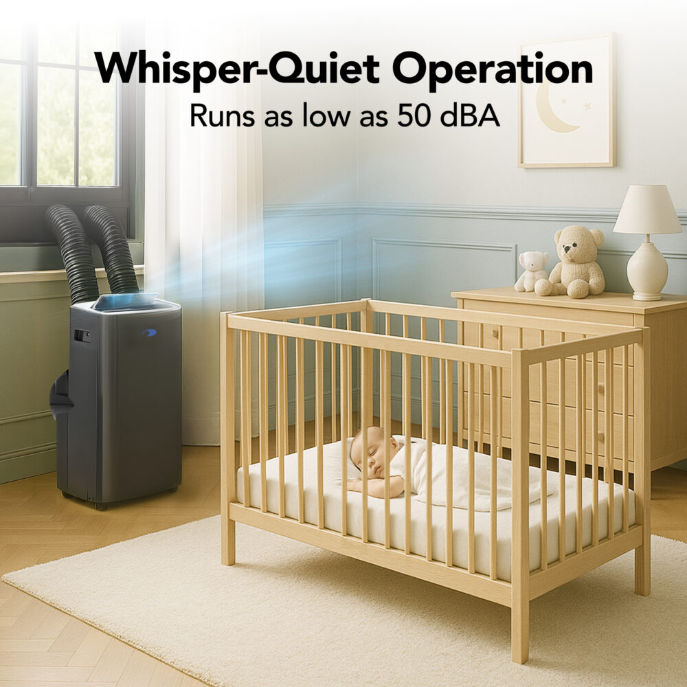 A portable air conditioner is a self-contained, freestanding unit designed to cool individual rooms. It includes wheels for easy movement, an exhaust hose, and a window kit to vent hot air outside. Some models also include a heat function using reverse air conditioning, allowing you to warm a room in cooler weather. Ideal for homes, offices, dorms, server rooms, and more.