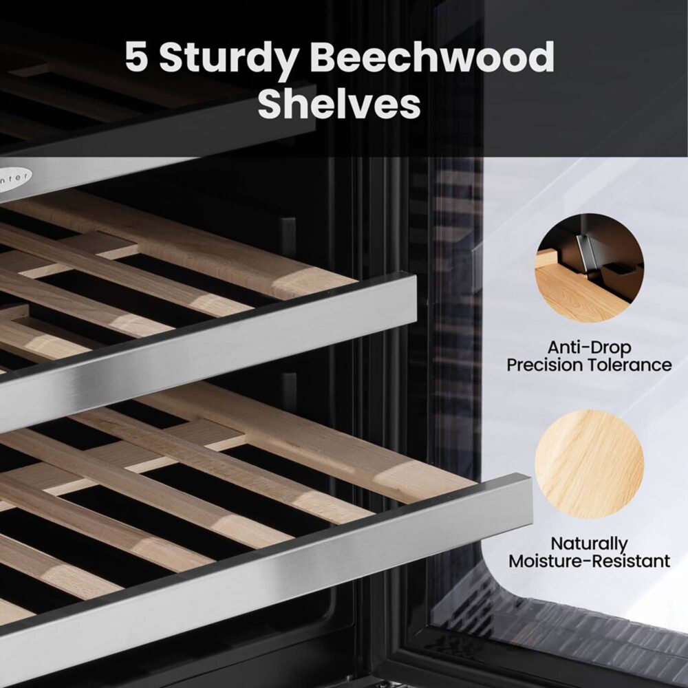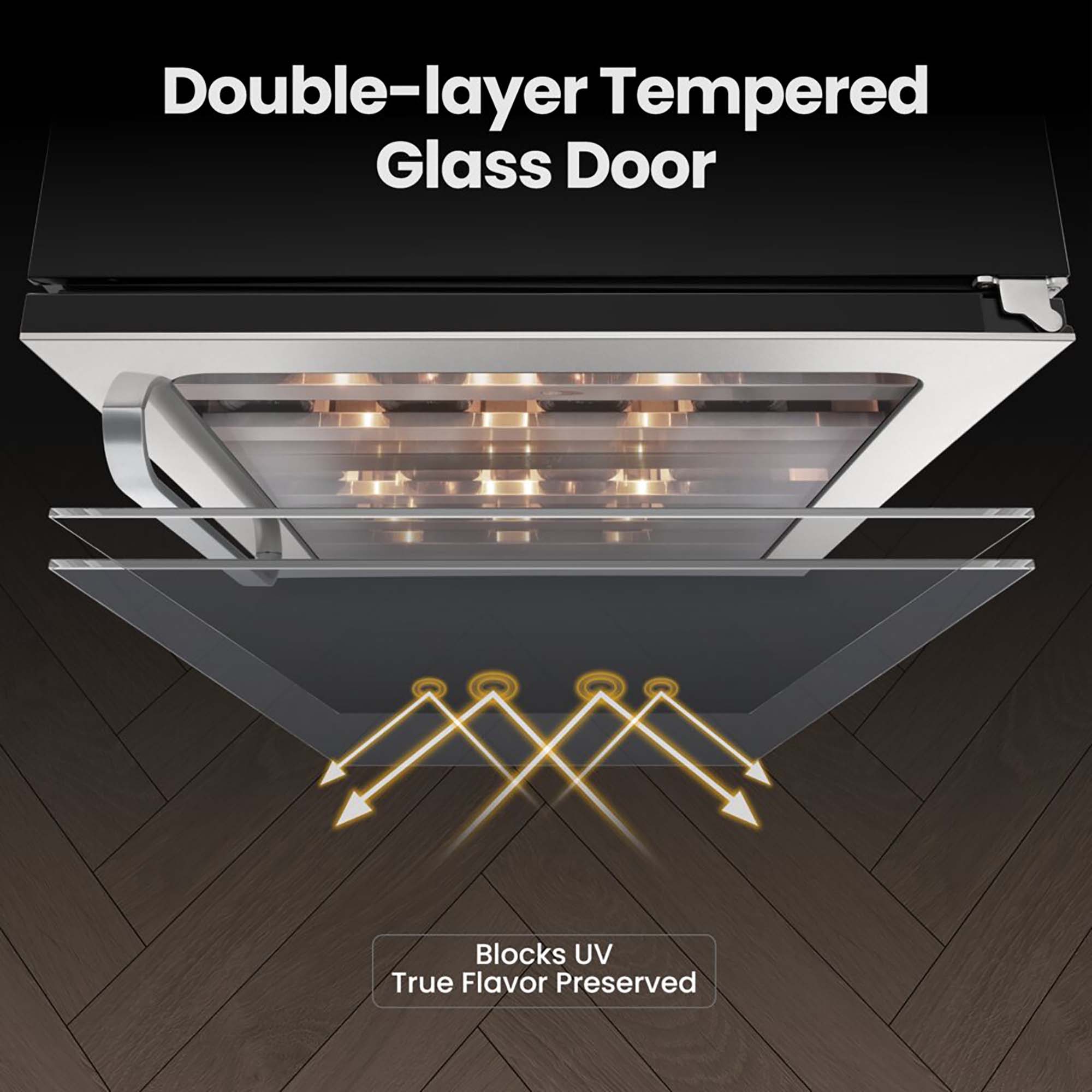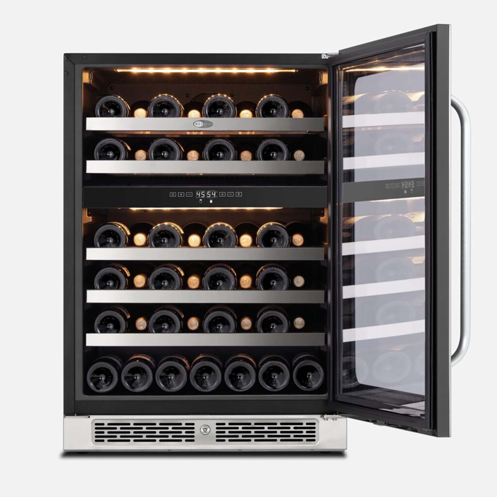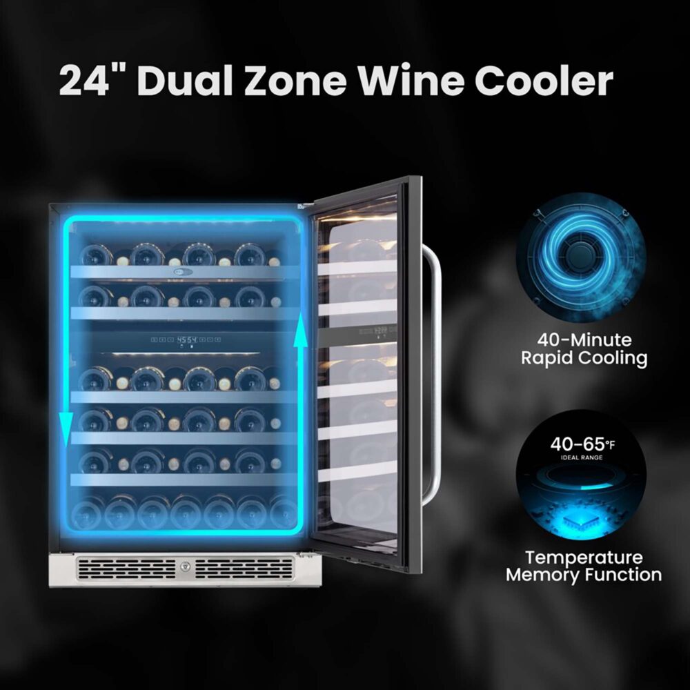 Whynter 24-inch Dual Zone Wine Fridge holds 46 bottles(upper zone: 16 bottles, lower zone: 30 bottles). Dual-zone temperature control system(40-65 °F), preset with the upper zone cooler than the lower zone for ideal storage conditions. Advanced internal fan-forced circulation ensures uniform temperature distribution in the cabinet. Premium dual-pane anti-UV glass door protects wines from light damage. Elegant curved handles for sophisticated access. Adjustable beechwood shelves allow flexible storage.