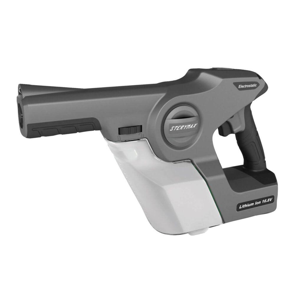 The Whynter Sterymax 360 Professional Electrostatic Sprayer places a positive charge on the liquid twice, once before entering the nozzle, and again at the nozzle, resulting in the maximum volume of liquid being charged and sprayed at surfaces (most surfaces are either negative or neutral) allowing for a complete 360 degrees wraparound coverage.